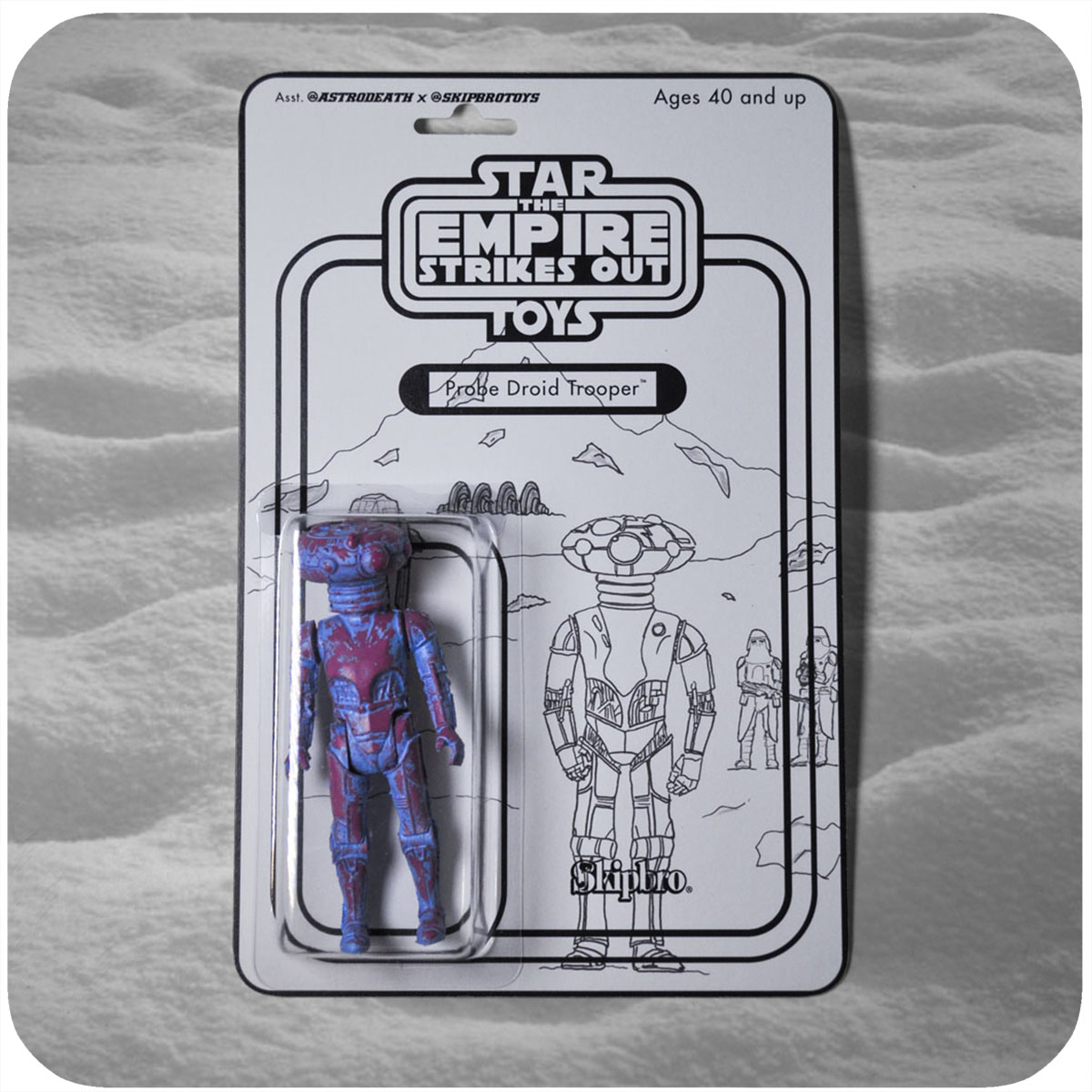 The "Probe Droid Troper" is hand cast in colored plastic featuring detailed paint applications. It is mounted on a cardback with art designed by Star Wars artist @AstroDeath.