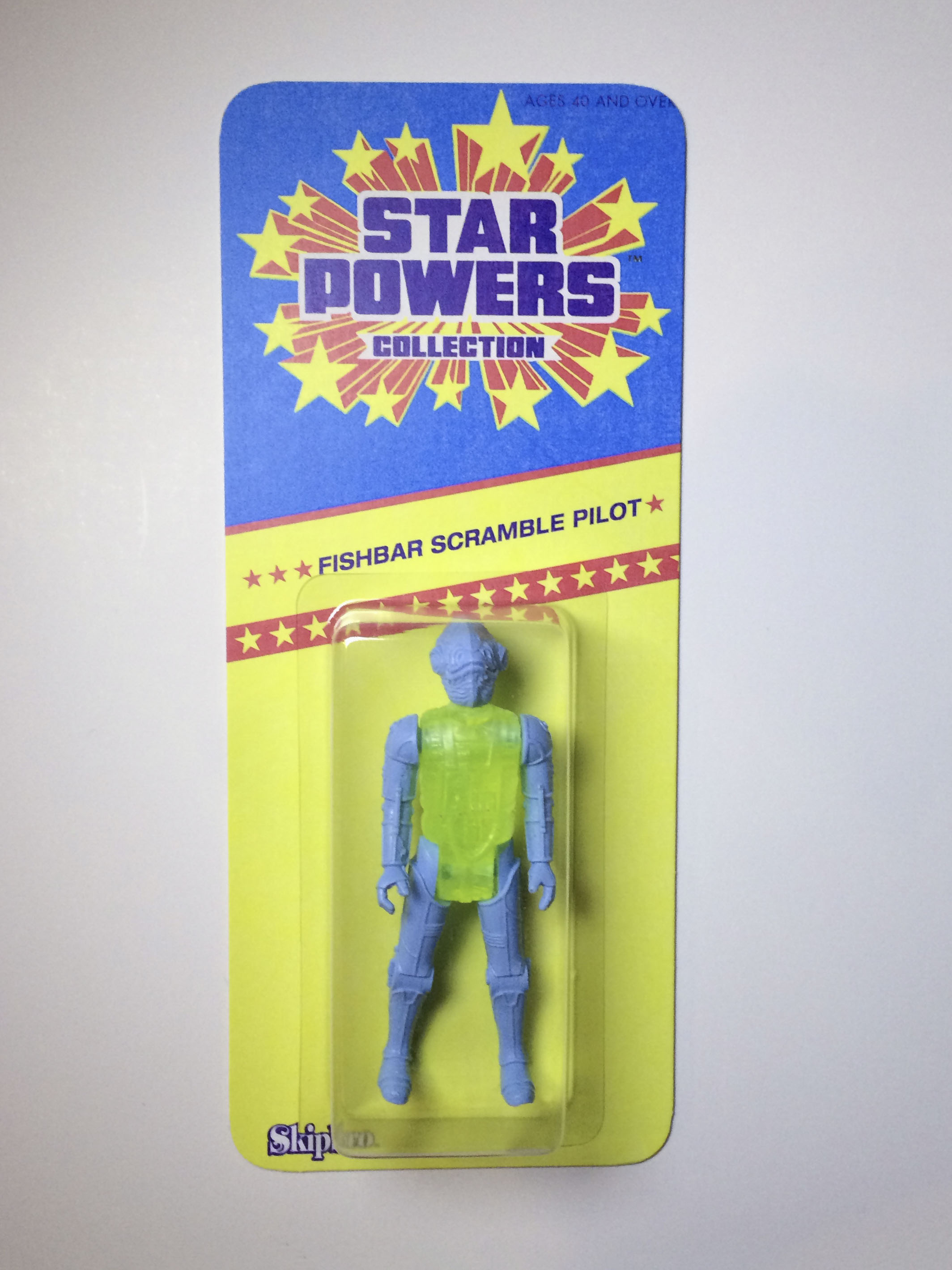 This Fishbar Scramble Pilot is hand cast in transparent lime and opaque blue colored plastic. It comes mounted on a cardback.