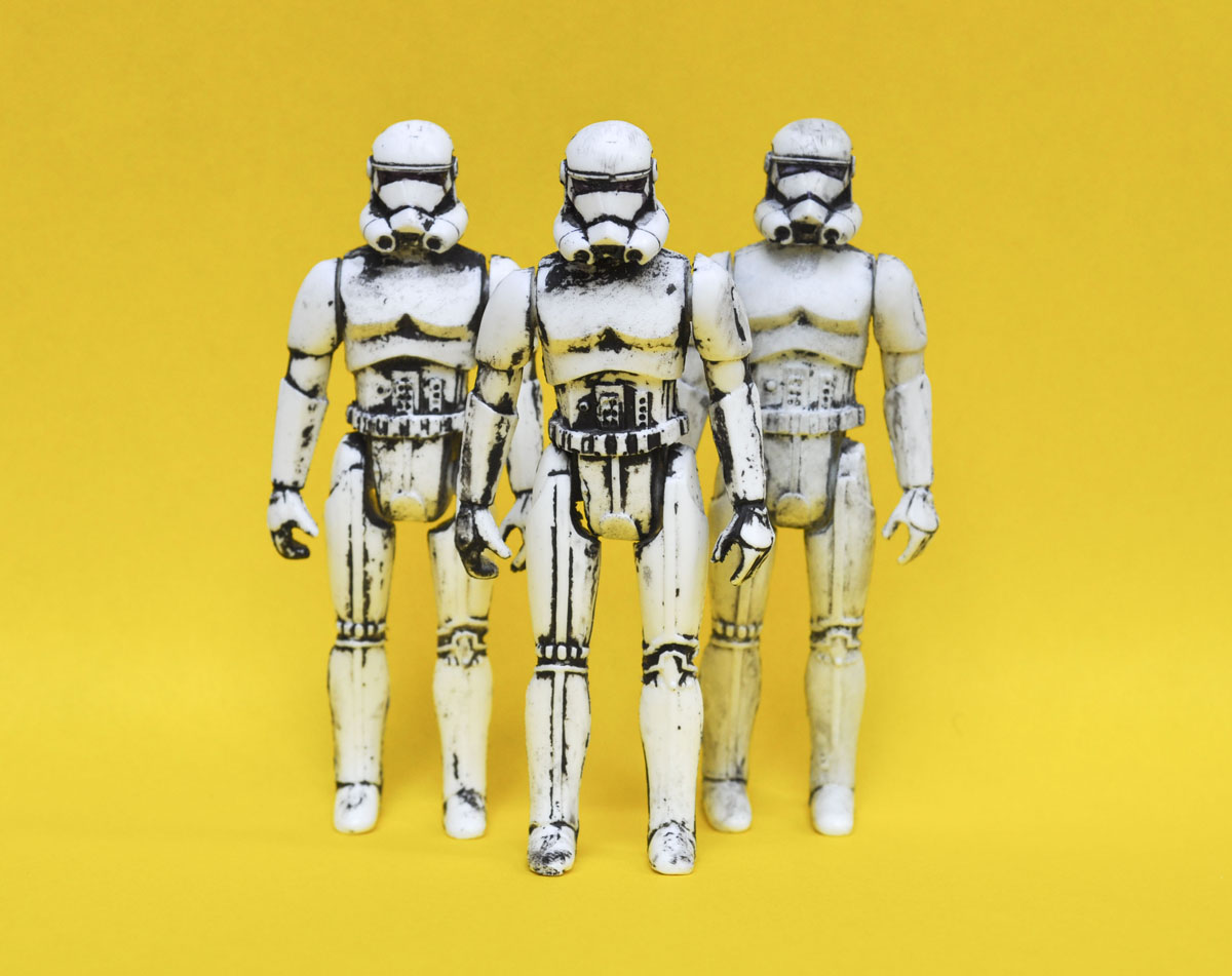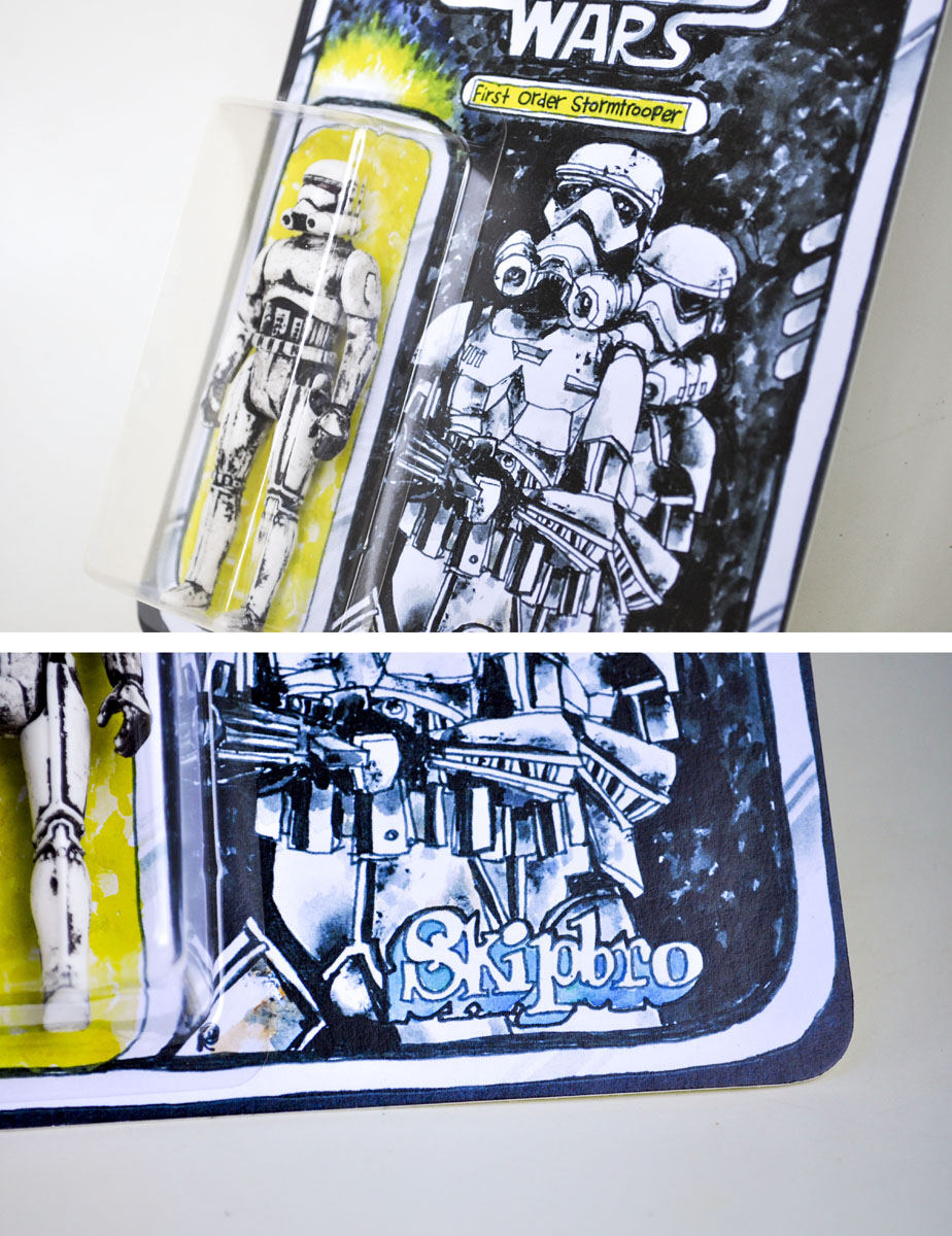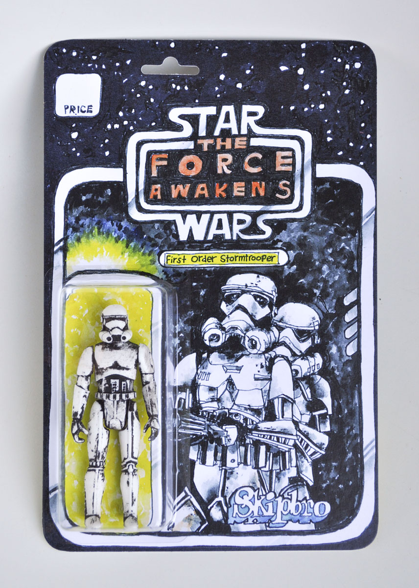 The First Order Stormtrooper is hand cast in plastic, features detailed paint applications, and is mounted on a cardback featuring art designed by Star Wars artist Randy Walker.