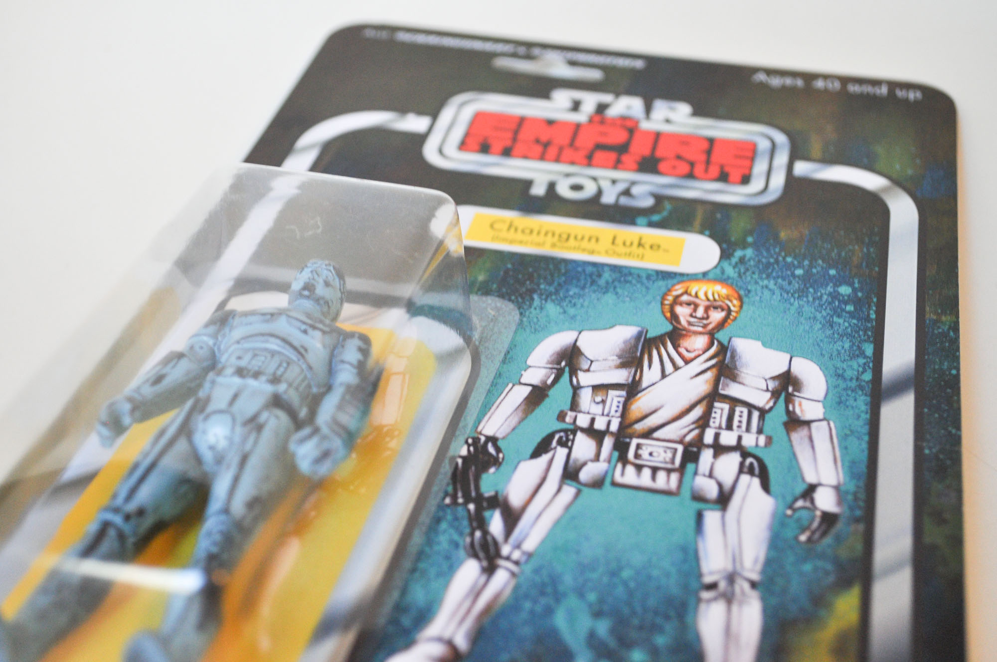 "Chaingun Luke" is hand cast, fully painted, and mounted on a cardback featuring art by UK based artist David Withers (aka @ChainGunArt).