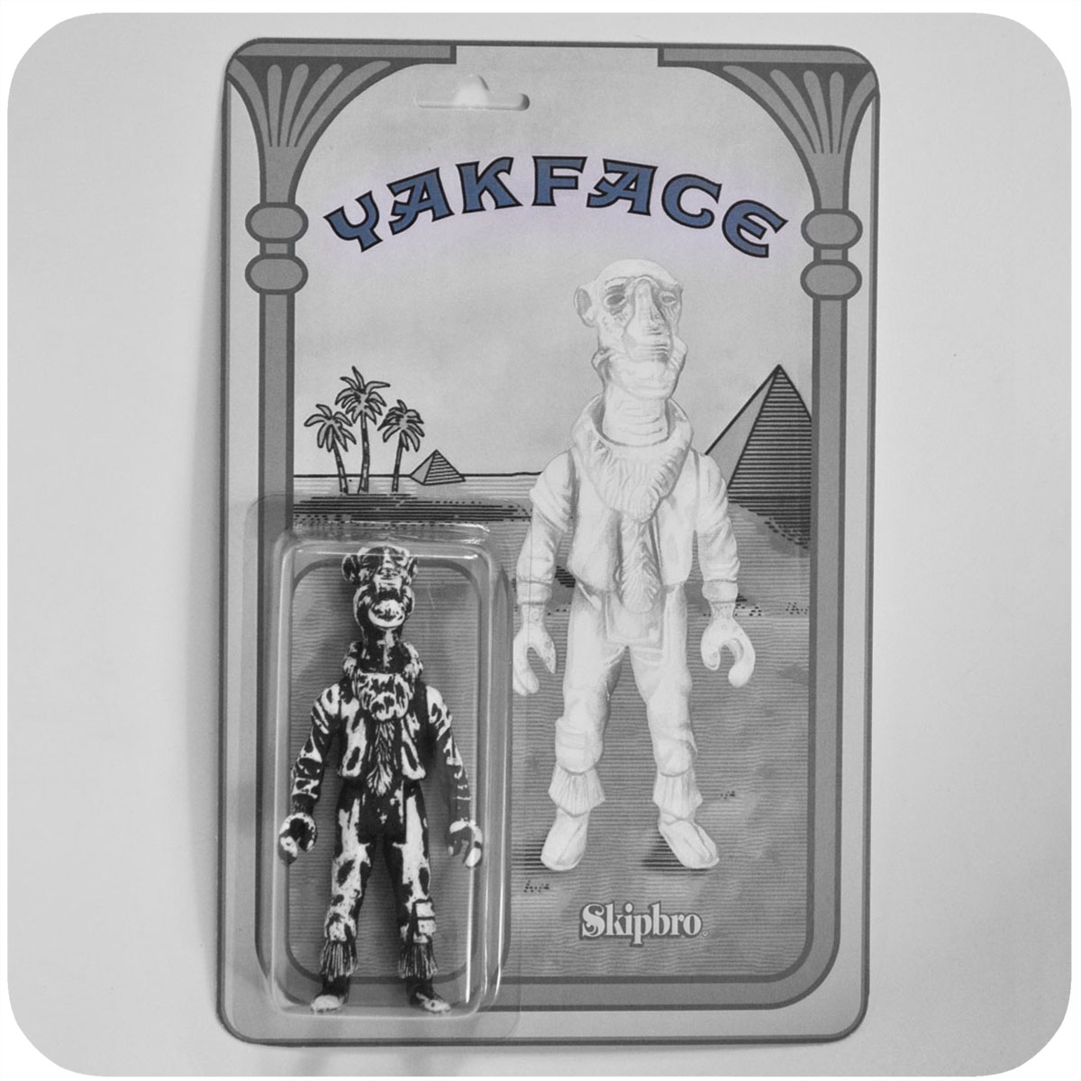 The Black and White Yakface is hand cast in plastic featuring detailed paint applications and custom card artwork by artist @Jshi_Art.