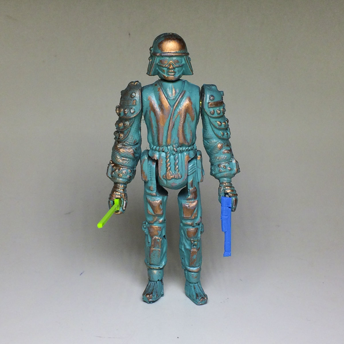 You will receive one highly detailed action figure with zero points of articulation that stands approximately 3.75 inches tall and comes with 2 accessories; a 3D printed "light sword" and a 3D printed "space pistol." This art toy is not a toy. Recommended for ages 30 and up.