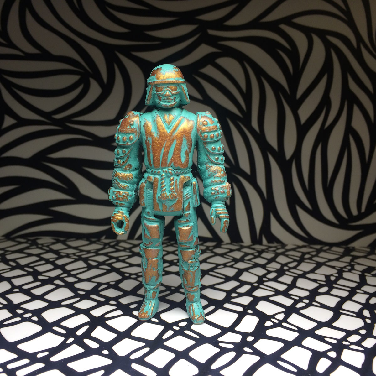 This figure is hand cast in bronze flake metallic resin with a blue patina paint wash. It also features an incredible screen printed card back on foil stock with illustration by artist Tim Baron.